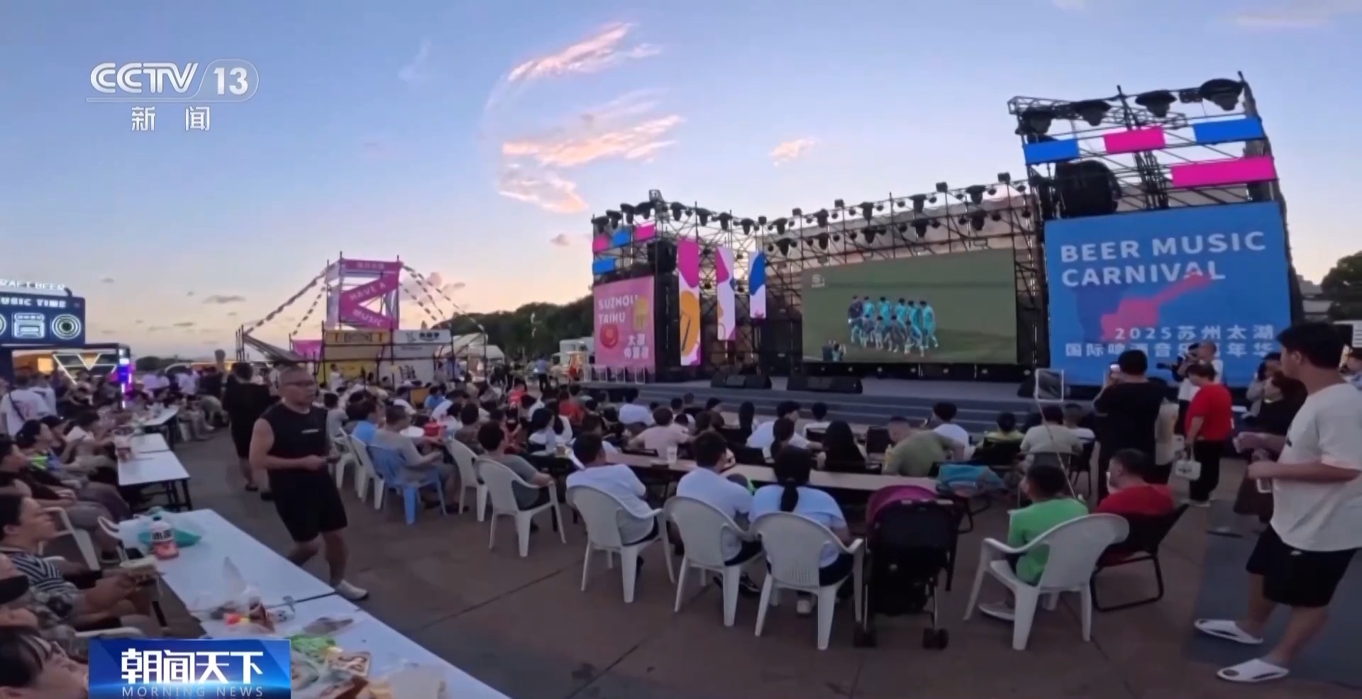 在江苏苏州太湖之滨,一方巨幕临水而立,临湖广场化身城市“会客厅”,吸引游客欢聚一堂,既可以观看赛事直播、音乐表演,也可以品美食、喝啤酒,享受活力四射的缤纷夏夜。