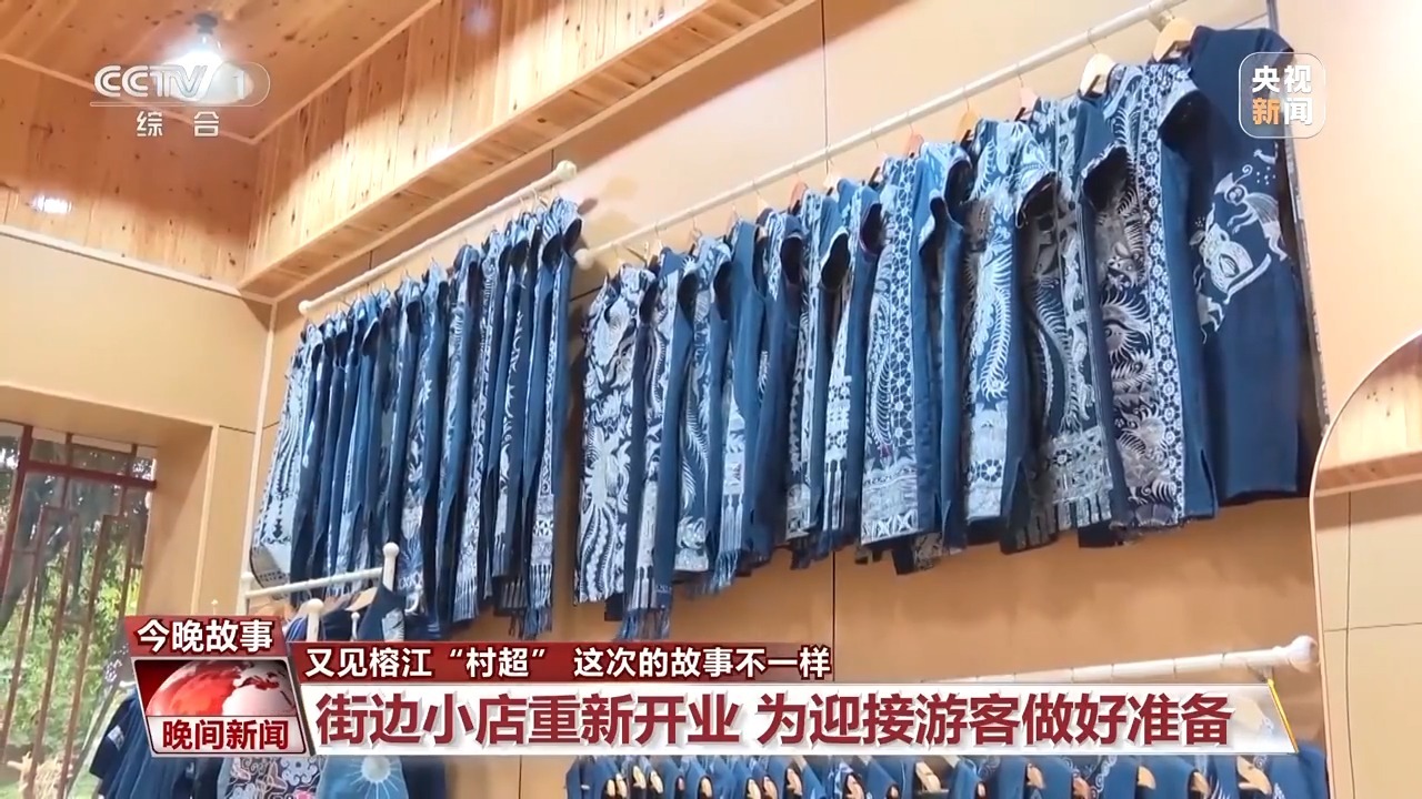 而在距离球场不远处的美食街上,餐饮和酒店正陆续恢复运营,一些面向游客开放的文创店铺也重新开业。被大家称为“村超兰兰”的刘勤兰,是一位返乡创业的榕江姑娘,她的蜡染文创店紧邻“村超”球场。在此前洪灾中,整个一层店面全部被淹。刘勤兰和工人们连续奋战四天,让店铺以全新面貌重新开业。