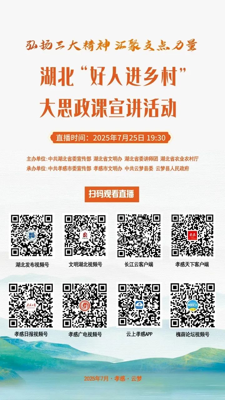 关注湖北发布视频号、文明湖北视频号、长江云、孝感天下客户端、孝感日报视频号、孝感广电视频号、云上孝感APP、孝感槐荫论坛视频号,网上同步直播
