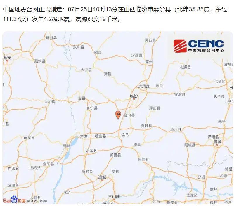 中国地震台网正式测定:7月25日10时13分在山西临汾市襄汾县(北纬35.85度,东经111.27度)发生4.2级地震,震源深度19千米。