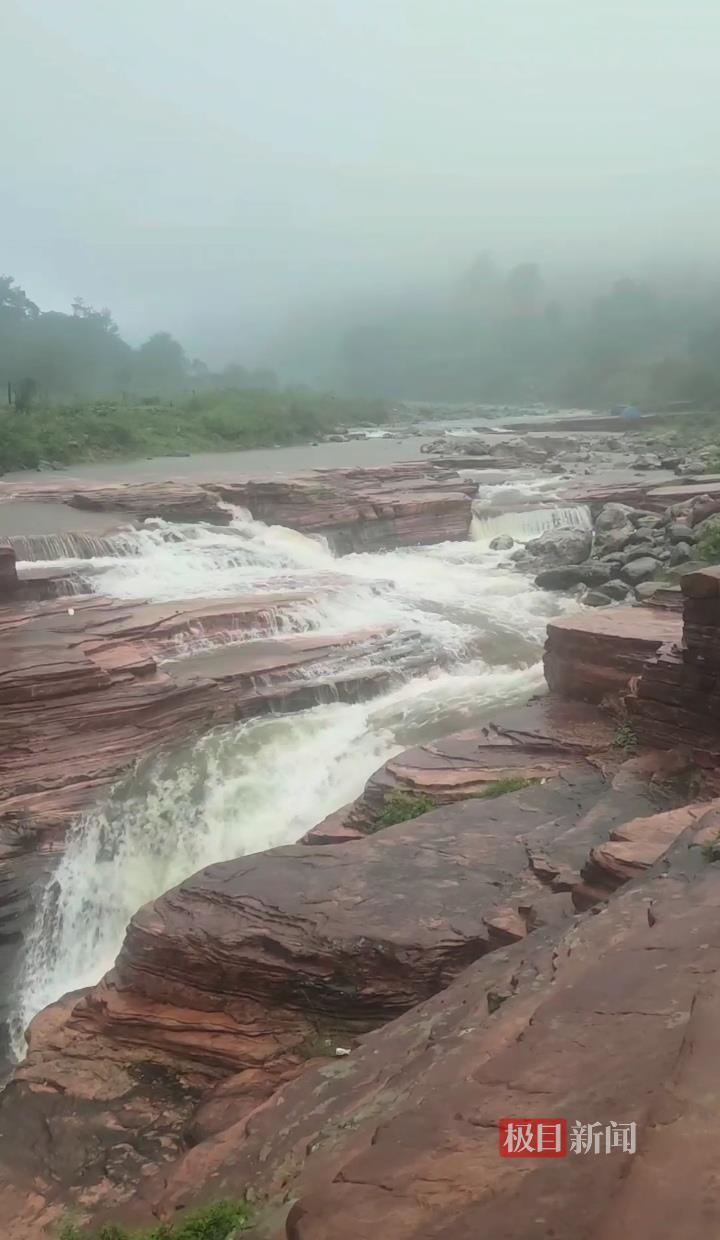抱犊村老龙口农家乐的秦二平告诉极目新闻记者,他家距离瀑布步行不到10分钟。7月24日晚7时许,当地出现强降雨,25日上午7时许,他发现瀑布上游水量增大,走到瀑布落水口,听到轰隆隆的声音,这才发现“断流”一年的瀑布终于又出现了。