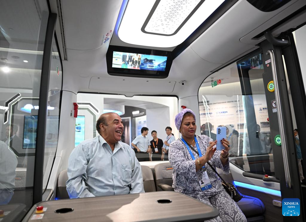 Participants of the Shanghai Cooperation Organization (SCO) Media and Think Tank Summit try an autonomous-driving bus at Zhengzhou Yutong Bus Co., Ltd. in Zhengzhou, central China's Henan Province, July 24, 2025. The SCO Media and Think Tank Summit is held in Zhengzhou from July 23 to 27. Participants are invited to visit various locations in Henan during the summit. (Xinhua/Li Jianan)