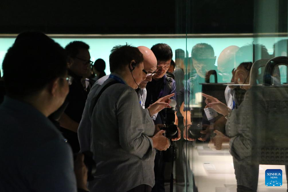 Participants of the Shanghai Cooperation Organization (SCO) Media and Think Tank Summit visit the Zhengzhou Shang Dynasty Ruins Museum in Zhengzhou, central China's Henan Province, July 23, 2025. The SCO Media and Think Tank Summit is held in Zhengzhou from July 23 to 27. Participants are invited to visit various locations in Henan during the summit. (Xinhua/Chen Wei)