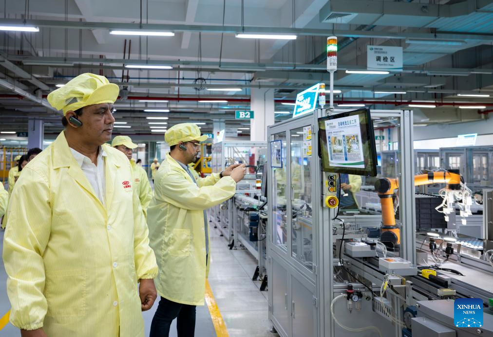 Participants of the Shanghai Cooperation Organization (SCO) Media and Think Tank Summit visit a factory of an instrument and meter company in Xuchang, central China's Henan Province, July 23, 2025. The SCO Media and Think Tank Summit is held in Zhengzhou from July 23 to 27. Participants are invited to visit various locations in Henan during the summit. (Xinhua/Fu Tian)