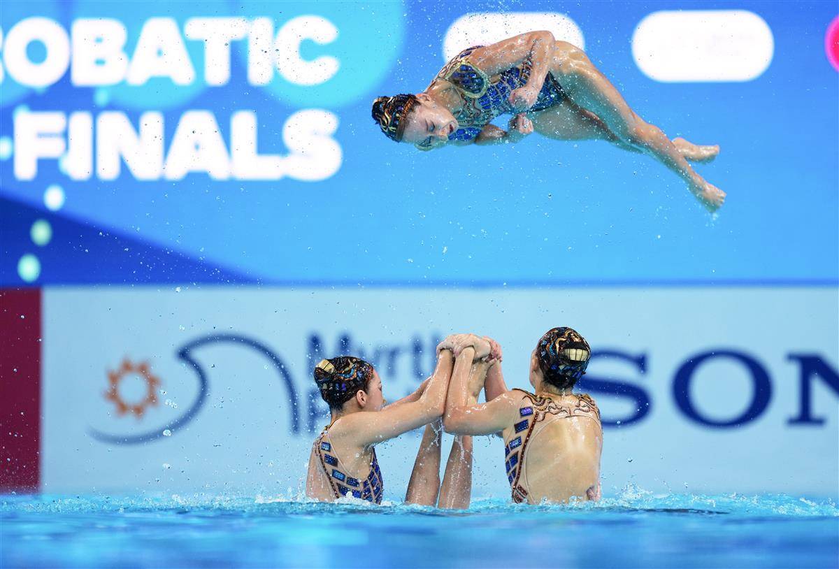 7月25日,中国队在集体技巧自选决赛中。(新华社发)
