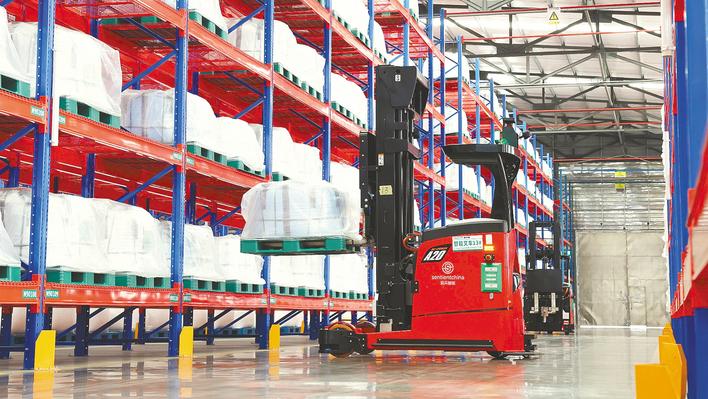 近日,荆门市掇刀区格林美AGV智能仓储区内,智能叉车精准完成扫码、抓取、移送等动作,成品入库全程无人介入。 (湖北日报全媒记者 陈少哲 通讯员 汪琪 摄)