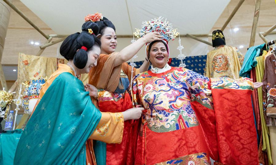 A participant (R) of the Shanghai Cooperation Organization (SCO) Media and Think Tank Summit tries traditional Chinese attire at the venue of the summit in Zhengzhou, central China's Henan Province, July 25, 2025. (Xinhua/Bai Xueqi)