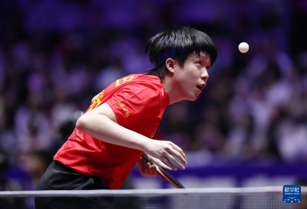 7月26日,山东魏桥·向尚运动队选手王楚钦在比赛中回球。他在单打比赛中3比1战胜山东鲁能队选手松岛辉空。