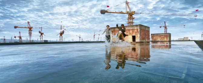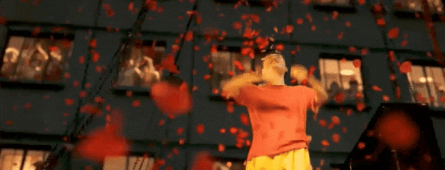 影片中,郎朗出国前搬钢琴的一幕,给人留下深刻印象。少年郎朗在空中弹奏,头顶倾泻而下一束光,花瓣从天而降,与背景居民楼中探出的脸庞形成了奇妙的组合,共同构成一场超现实的“空中音乐会”。
