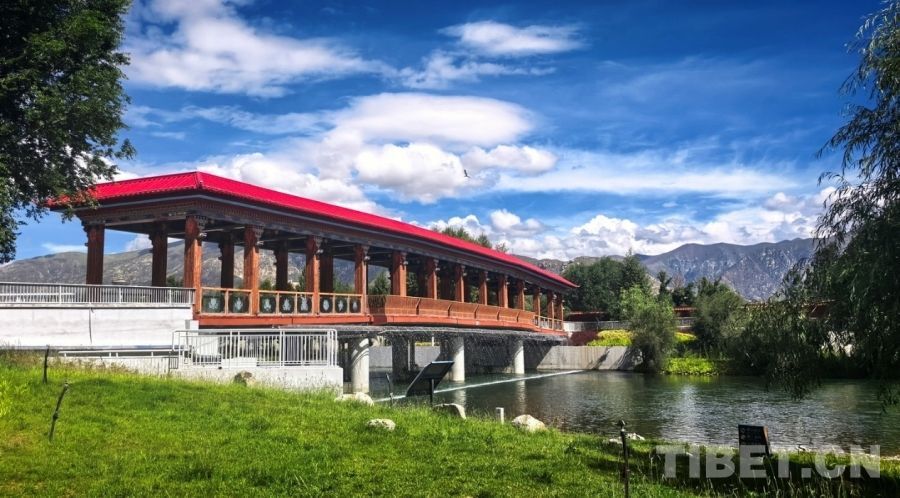 图为拉萨两岛内河绿色生态廊道上连通南北岸的廊桥 摄影:刘莉