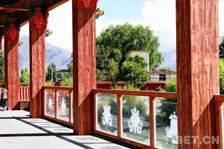 图为拉萨两岛内河绿色生态廊道上连通南北岸的廊桥护栏装饰着吉祥八宝图案 摄影:刘莉
