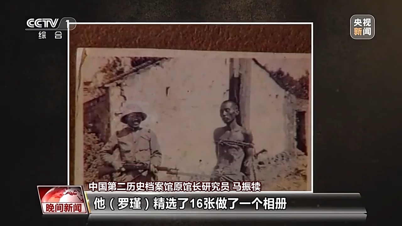 中国第二历史档案馆原馆长研究员 马振犊:日本军官他们照这个照片,完全是为了一种娱乐和发泄,他(罗瑾)精选了16张做了一个相册,而且自己为这个相册做了一个封面,上面画的滴血的心。还有一把刀插在心上面。他的意图是把这些日本人自拍的,屠杀中国人的照片作为一种历史证据把它留下来。