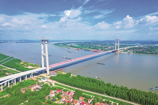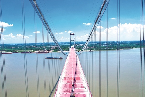 双柳长江大桥是国家高速路网武汉都市圈环线的重要组成部分和湖北省“十四五”规划中的重点建设项目,工程全长35.043千米,设计时速120千米,连接武汉新洲和鄂州华容,是目前长江上最宽的钢箱梁悬索桥。双柳长江大桥雄踞武汉“东大门”,具有“主塔高、跨度大、桥面宽、材料新”四大特点。其中,南北主塔高度分别为212.78和213.75米,主跨1430米,采用双向8车道标准建设,桥梁全宽50.5米。