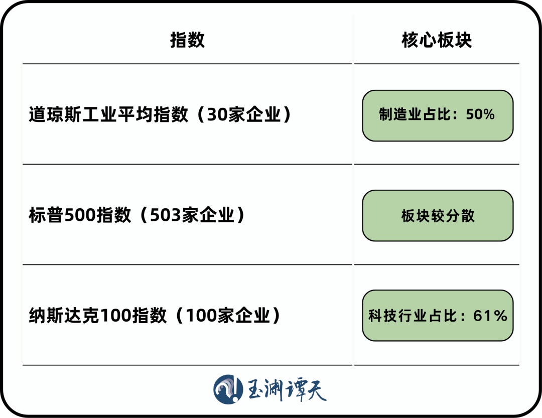 标普500和纳斯达克采用“市值加权”,权重最大的是那几个科技巨头;而道指用的是“股价加权”,高价股走强,也能拉动整体指数。
