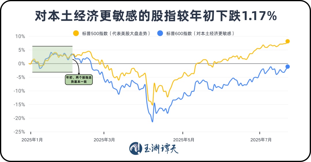 而对本土经济更敏感的标普600小盘股指数,从年初到现在一直走弱,整体走势远不如大盘。