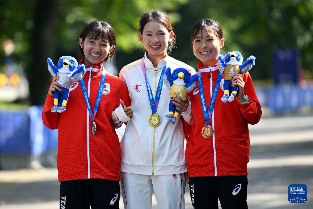 7月26日,冠军中国选手马秀针(中)、亚军日本选手土屋舞琴(左)和季军日本选手野田真理那在颁奖仪式上。