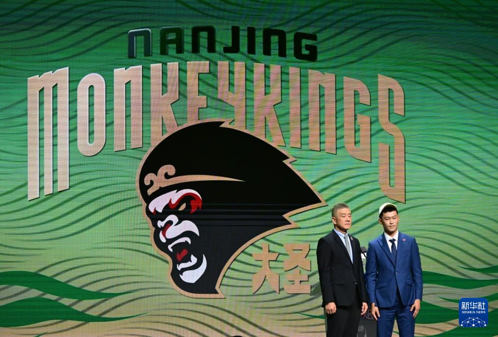 7月26日,来自清华大学的杨曦皓(右)在选秀大会上展示“状元及第”横幅。他在第一顺位被福建浔兴俱乐部选中。