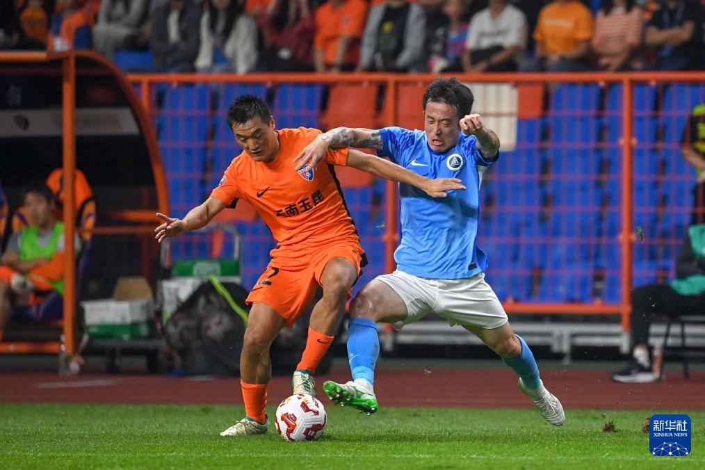 7月26日,云南玉昆队球员唐淼(左)与深圳新鹏城队球员姜至鹏在比赛中拼抢。