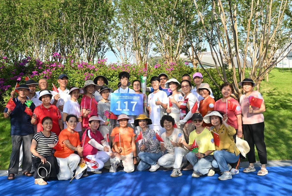 7月26日,赵明阳(中)在火炬传递前与市民合影。
