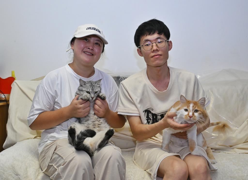 7月23日,赵明阳与爱人一起展示他们收养的流浪猫。