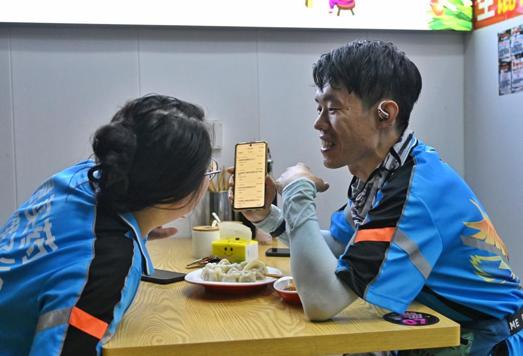 7月22日晚,赵明阳与爱人一起吃晚饭时向爱人展示当晚的跑单成果。