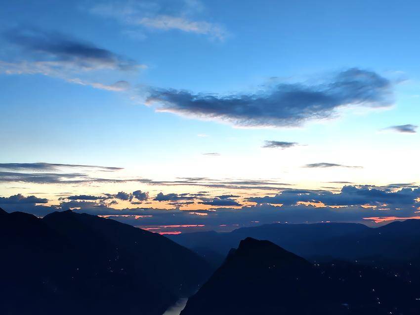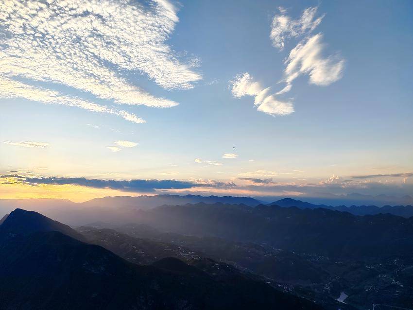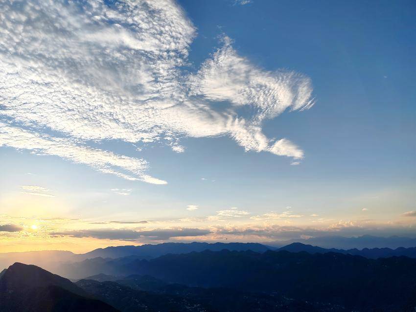 天空中,云朵被染成了橙红、金黄、淡紫等五彩斑斓的颜色,形态各异,有的如轻盈的羽毛,有的似奔腾的骏马,有的似瑞龙呈祥,有的似春蚕破茧,与连绵的山脉相映成趣,构成了一幅令人心旷神怡的绝美画面。