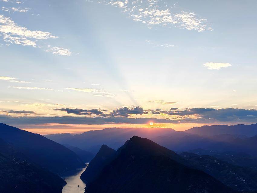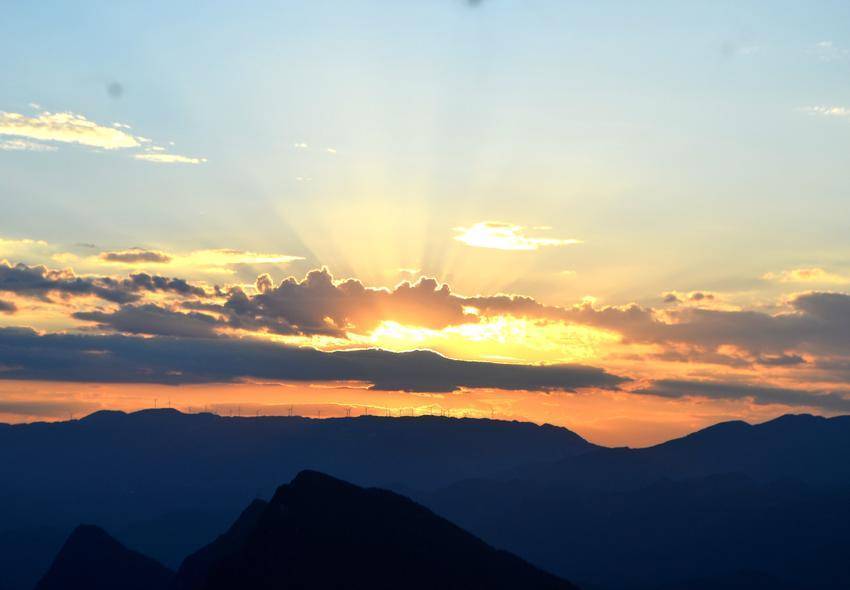 7月26日傍晚时分,太阳渐渐在巴东西沉,金色的光芒穿透云层,在天际间绽放出万道霞光。远处的山峦在晚霞的映照下,轮廓愈发清晰,层次分明,宛如一幅浓墨重彩的山水画。