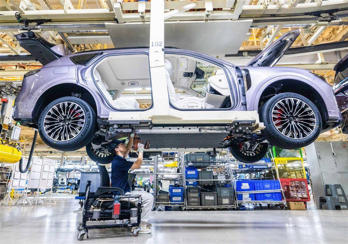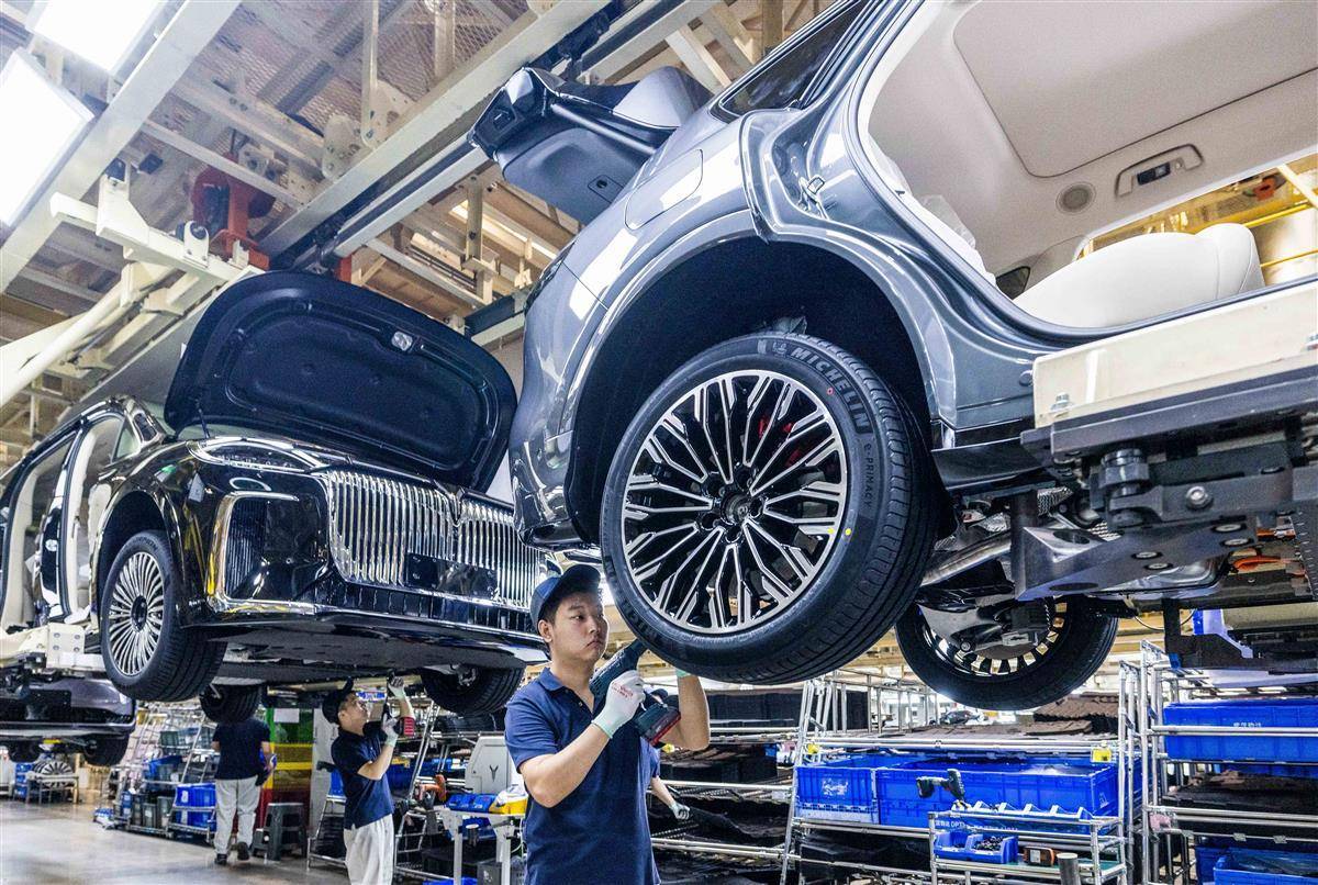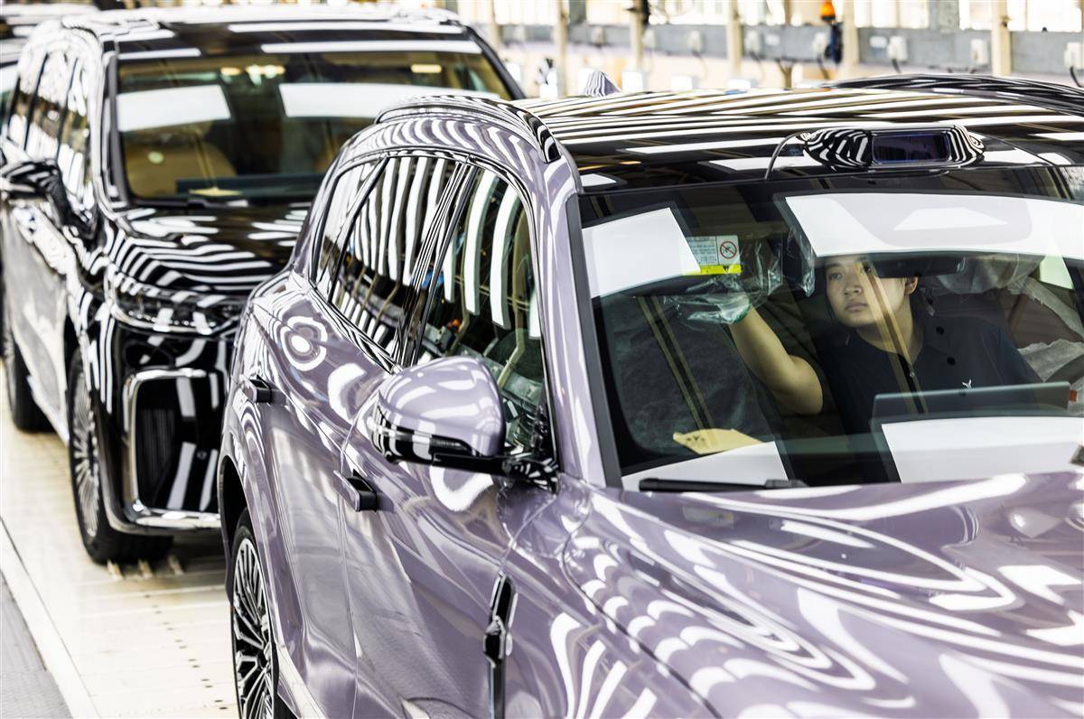 7月24日,位于武汉经开区的岚图汽车总装车间内,工人正在生产线上忙碌,岚图FREE+等车型新能源车加紧下线。