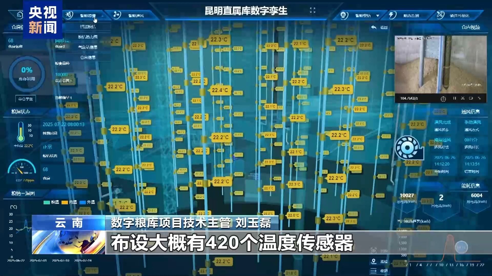 数字粮库项目技术主管 刘玉磊:像这一个万吨仓,布设大概有420个温度传感器。它布的点就相当于是网格化管理,“住”在这个区域的粮食出现问题,保管员可以快速找到。