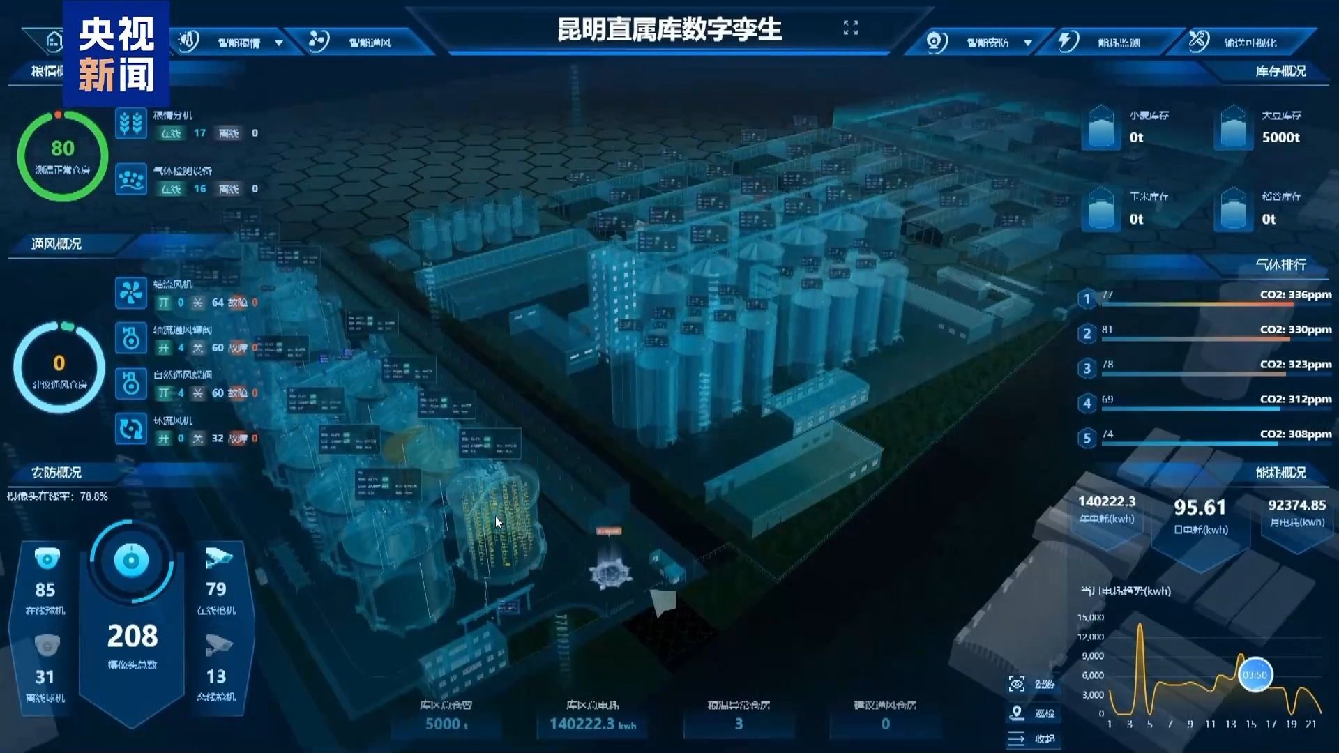 在昆明直属库中控室,管理团队借助眼前这个数字孪生系统,不出半个小时就可完成300多亩库区的“云上”巡检和数字漫游,复杂多变的粮食存储状态,在这里变成简单明了的“彩色温湿度地图”。