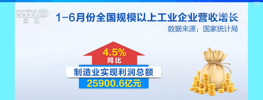 1—6月份,规模以上工业企业实现营业收入66.78万亿元,同比增长2.5%。制造业实现利润总额25900.6亿元,同比增长4.5%。