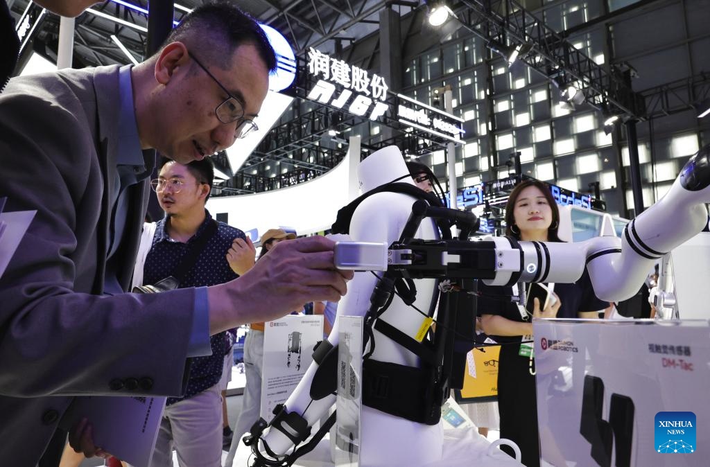 A visitor touches a robot equipped with visual and tactile sensors at the exhibition area of the 2025 World AI Conference and High-Level Meeting on Global AI Governance in east China's Shanghai, July 26, 2025. The event kicked off here on Saturday. More than 1,000 officials and representatives of industries, universities and research institutes from home and abroad attended the opening ceremony. (Xinhua/Fang Zhe)