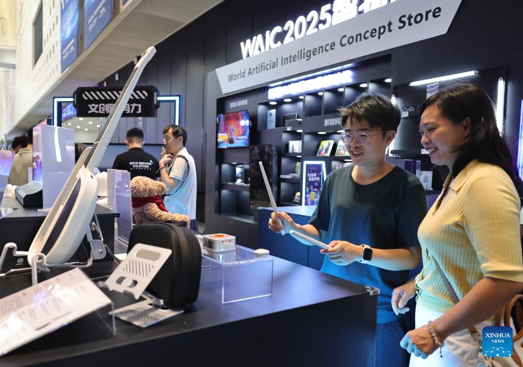 Visitors try an electronic virtual drum product at the exhibition area of the 2025 World AI Conference and High-Level Meeting on Global AI Governance in east China's Shanghai, July 26, 2025. The event kicked off here on Saturday. More than 1,000 officials and representatives of industries, universities and research institutes from home and abroad attended the opening ceremony. (Xinhua/Fang Zhe)