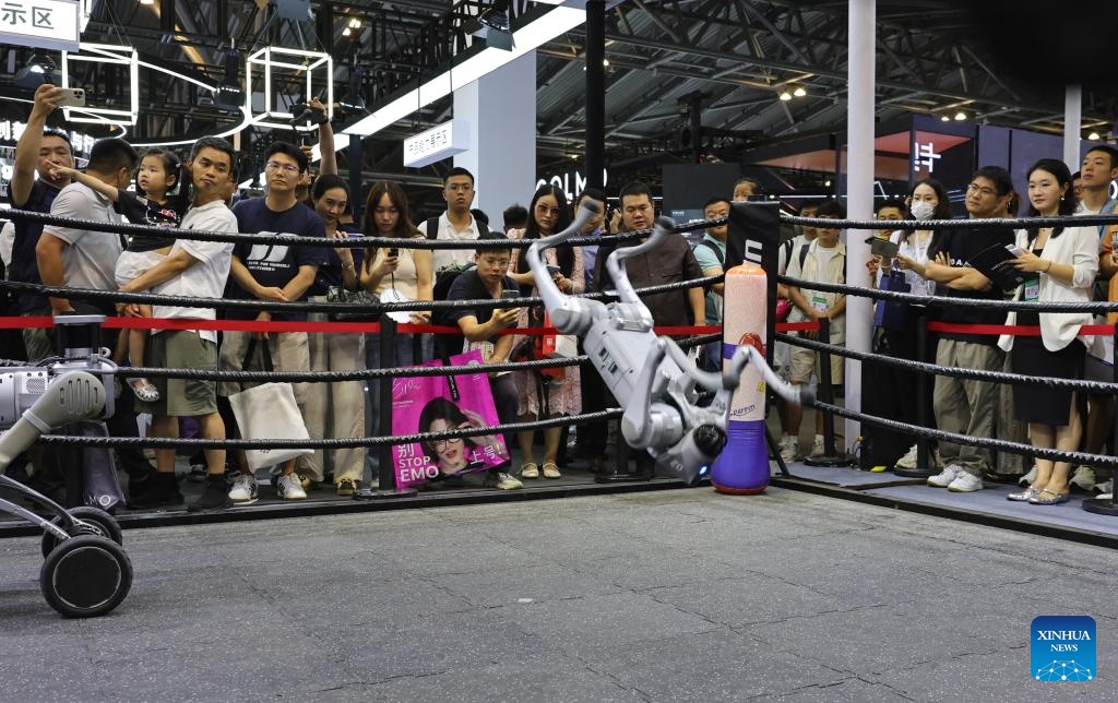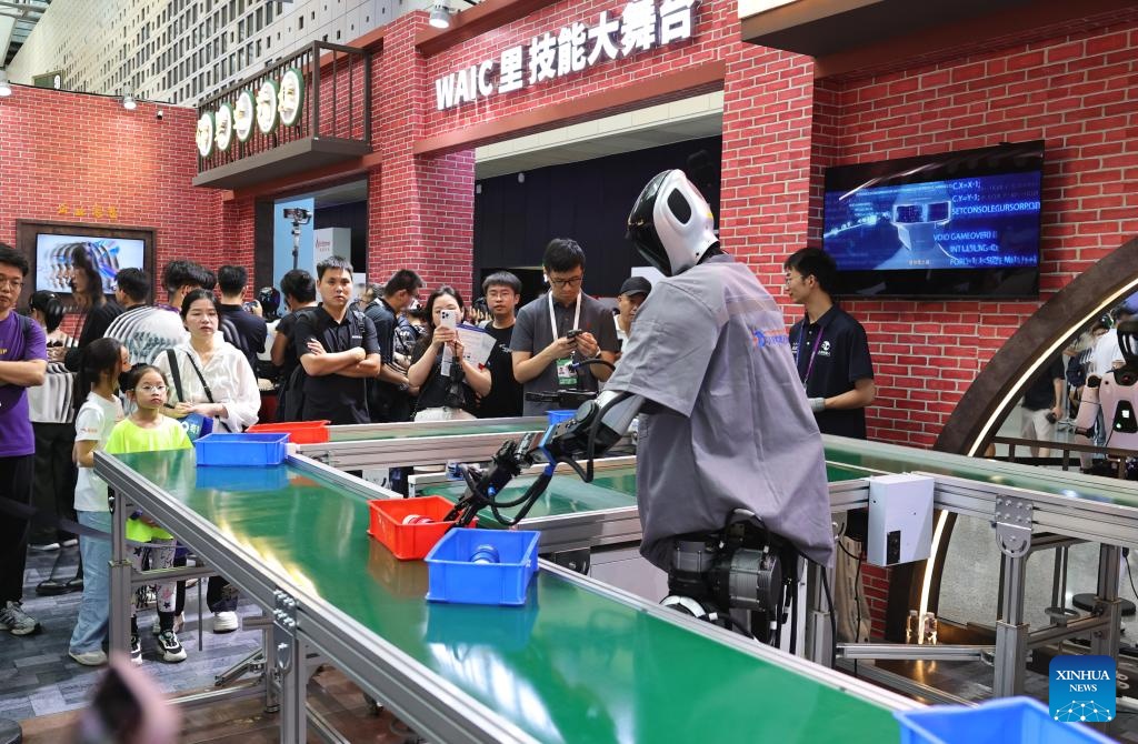 Humanoid robots simulate operation scenarios at the exhibition area of the 2025 World AI Conference and High-Level Meeting on Global AI Governance in east China's Shanghai, July 26, 2025. The event kicked off here on Saturday. More than 1,000 officials and representatives of industries, universities and research institutes from home and abroad attended the opening ceremony. (Xinhua/Fang Zhe)