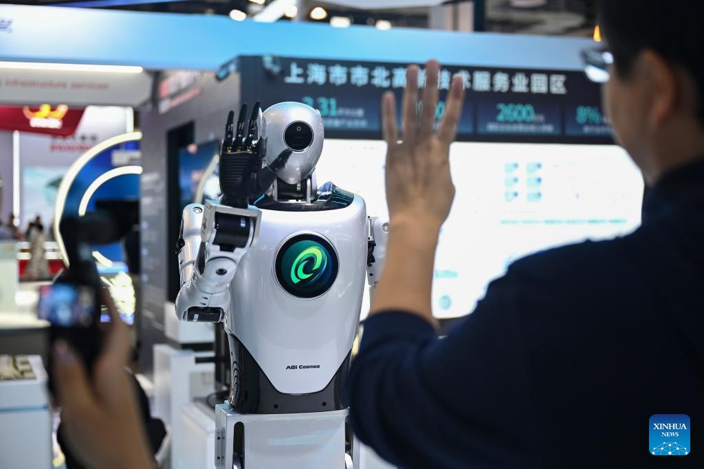 A visitor interacts with a humanoid robot at the exhibition area of the 2025 World AI Conference and High-Level Meeting on Global AI Governance in east China's Shanghai, July 26, 2025. The event kicked off here on Saturday. More than 1,000 officials and representatives of industries, universities and research institutes from home and abroad attended the opening ceremony. (Xinhua/Chen Haoming)