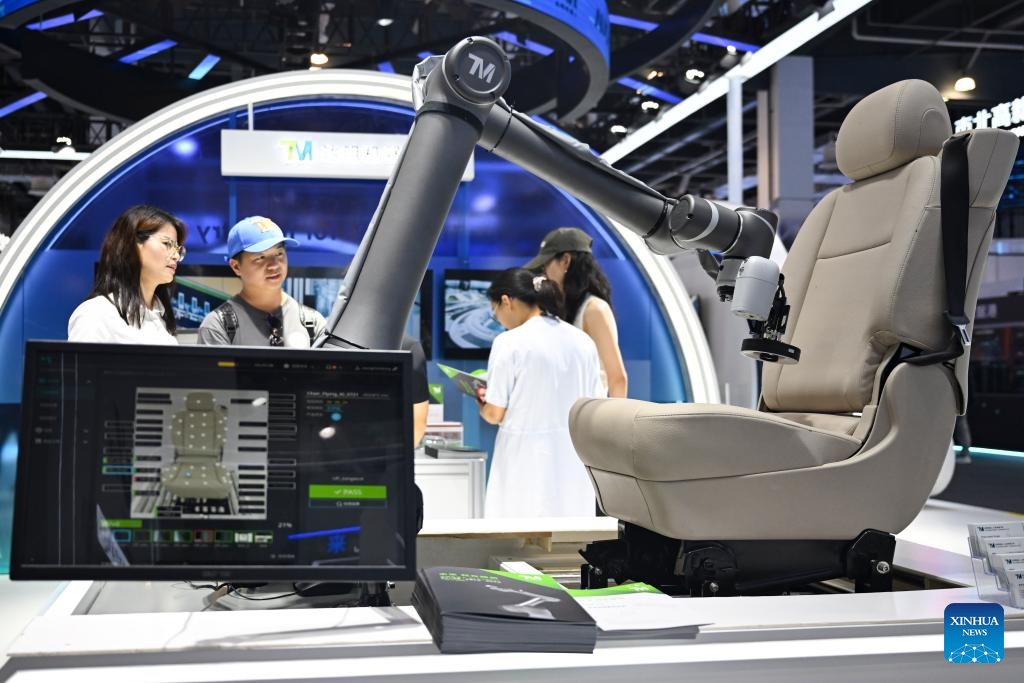 Visitors view a robot for quality checking at the exhibition area of the 2025 World AI Conference and High-Level Meeting on Global AI Governance in east China's Shanghai, July 26, 2025. The event kicked off here on Saturday. More than 1,000 officials and representatives of industries, universities and research institutes from home and abroad attended the opening ceremony. (Xinhua/Chen Haoming)
