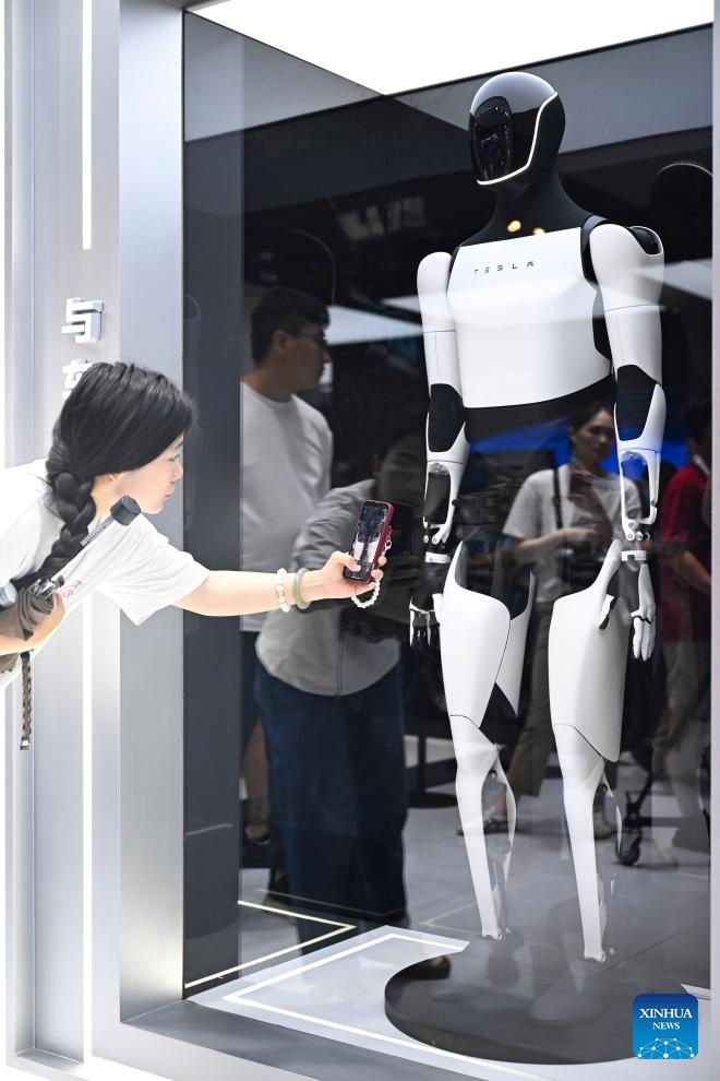 A visitor takes photos of a humanoid robot of Tesla at the exhibition area of the 2025 World AI Conference and High-Level Meeting on Global AI Governance in east China's Shanghai, July 26, 2025. The event kicked off here on Saturday. More than 1,000 officials and representatives of industries, universities and research institutes from home and abroad attended the opening ceremony. (Xinhua/Chen Haoming)