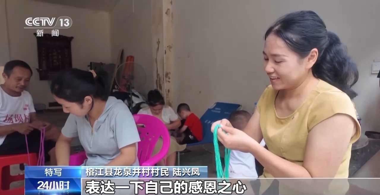 贵州省榕江县龙泉井村村民 陆兴凤:感恩回馈救援人员,我们就自觉地过来帮一点忙,想编蛋垄送给他们,表达一下自己的感恩之心。