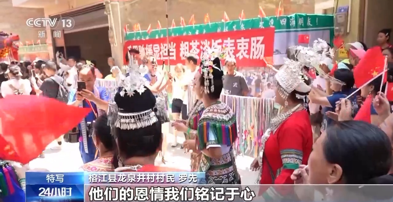 总台记者 郭亦馨:不止赛场上赛况激烈,球场外围的跑道上正在举行千人感恩大巡游。在半个月之前,救援队陆续撤出榕江县的时候,当地的百姓就和他们约好,当榕江“村超”重启之时,邀请他们再回榕江来看“村超”,今天他们如约而至。