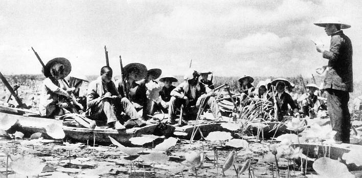 白洋淀游击队利用战斗间隙进行形势教育。