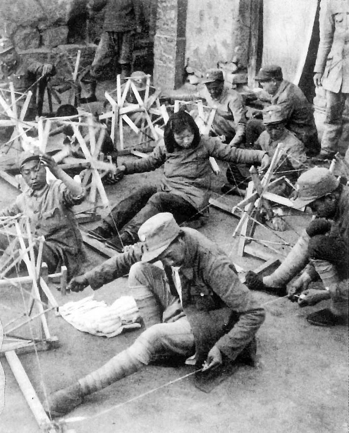 官兵在纺毛线。