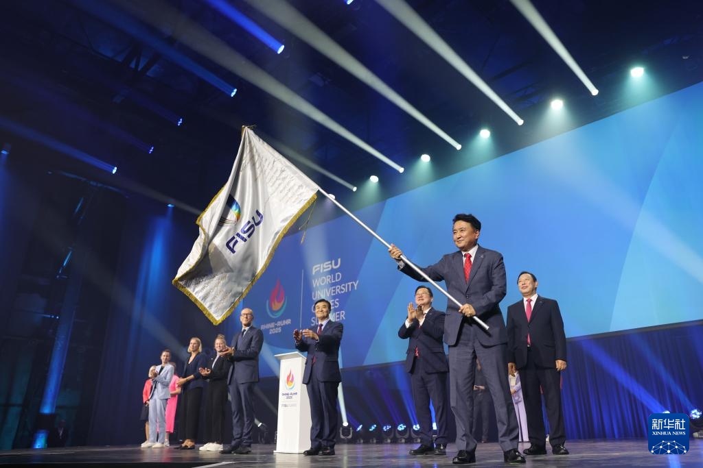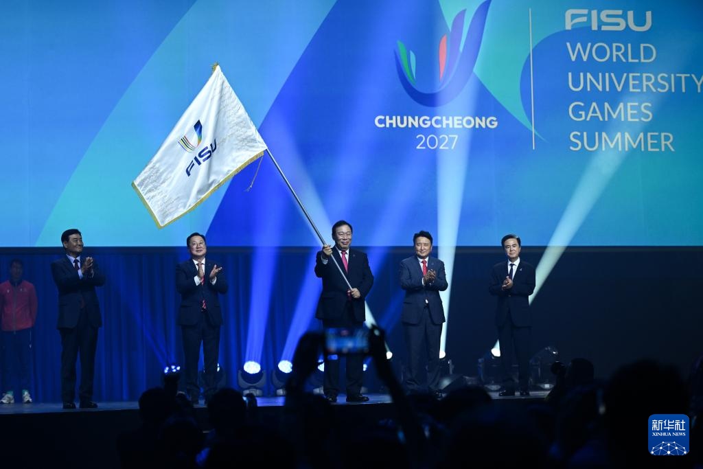 7月27日,2027年忠清道大运会主办地官员手持国际大学生体育联合会会旗。新华社记者 连漪 摄