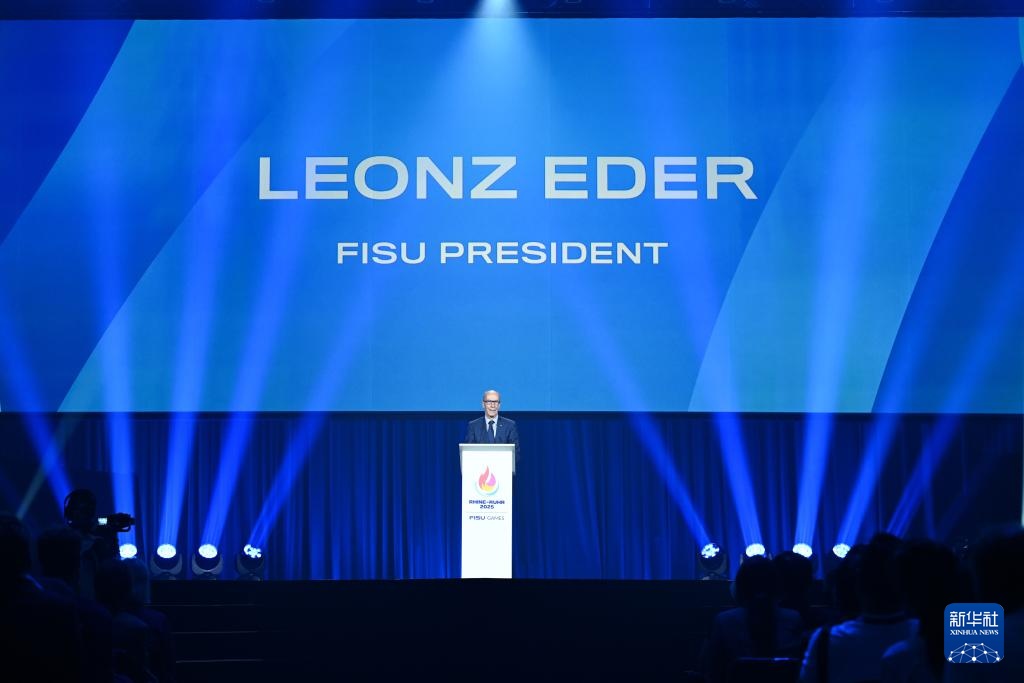 7月27日,国际大学生体育联合会主席雷诺·艾德在闭幕式上致辞。新华社记者 连漪 摄