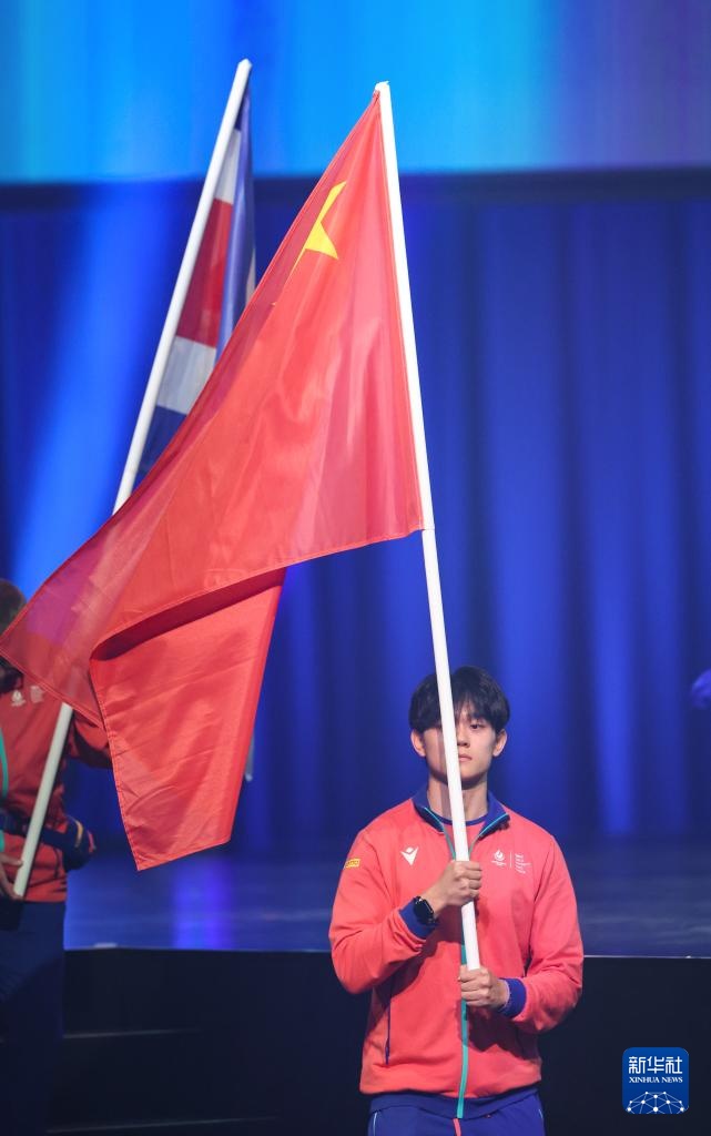7月27日,中国代表团旗帜在闭幕式上入场。新华社记者 张帆 摄