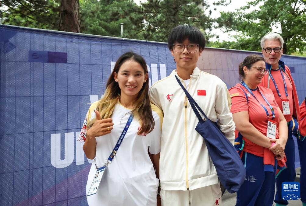 7月27日,中国田径运动员马秀针(左)和马瑞在闭幕式后合影。新华社记者 张帆 摄