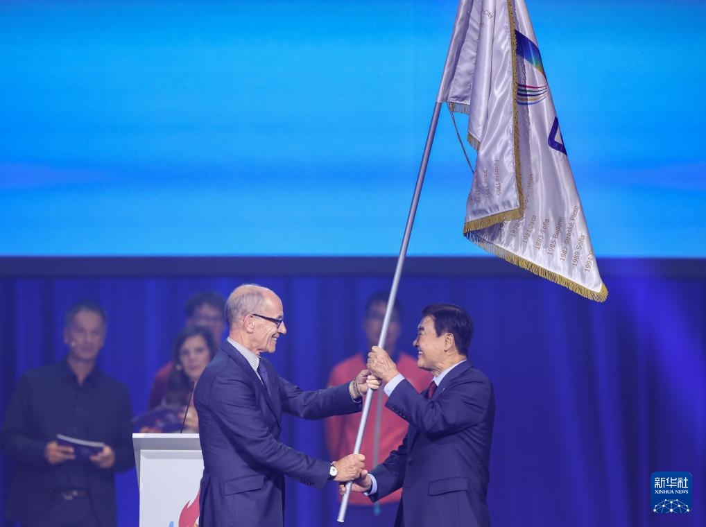 7月27日,国际大学生体育联合会主席雷诺·艾德(左)在闭幕式上将国际大学生体育联合会会旗交给2027年忠清道大运会组委会主席姜昌熙。新华社记者 张帆 摄