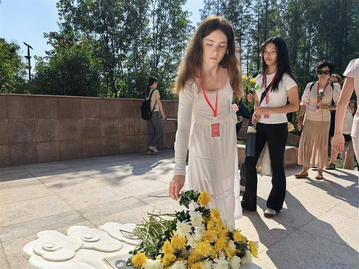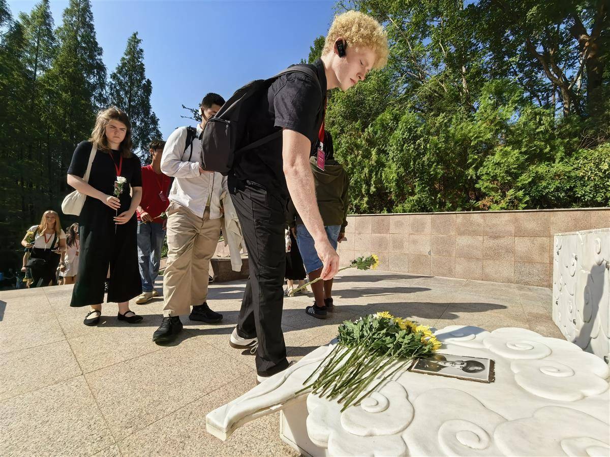 7月28日,在红安县李先念故居纪念园内,近百名美国“飞虎队”青少年夏令营成员在飞虎队队员本尼达的墓前依次献上鲜花,缅怀这位抗击日本法西斯的英雄。(湖北日报全媒记者 陈迹 陈少哲 摄)
