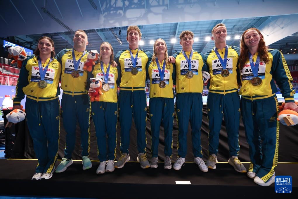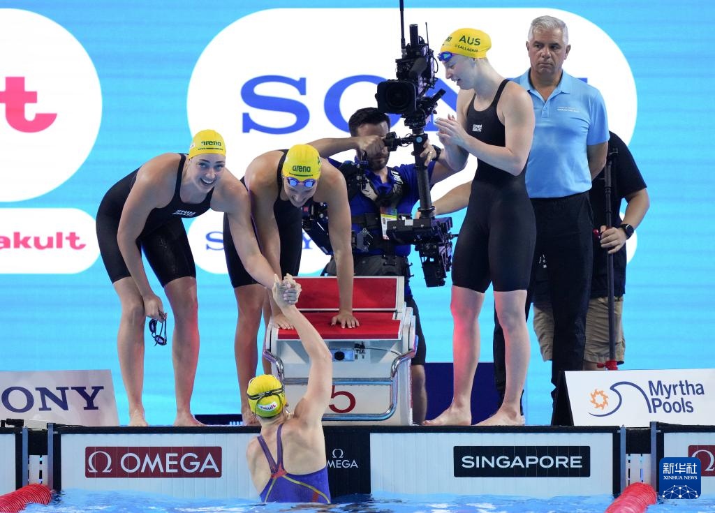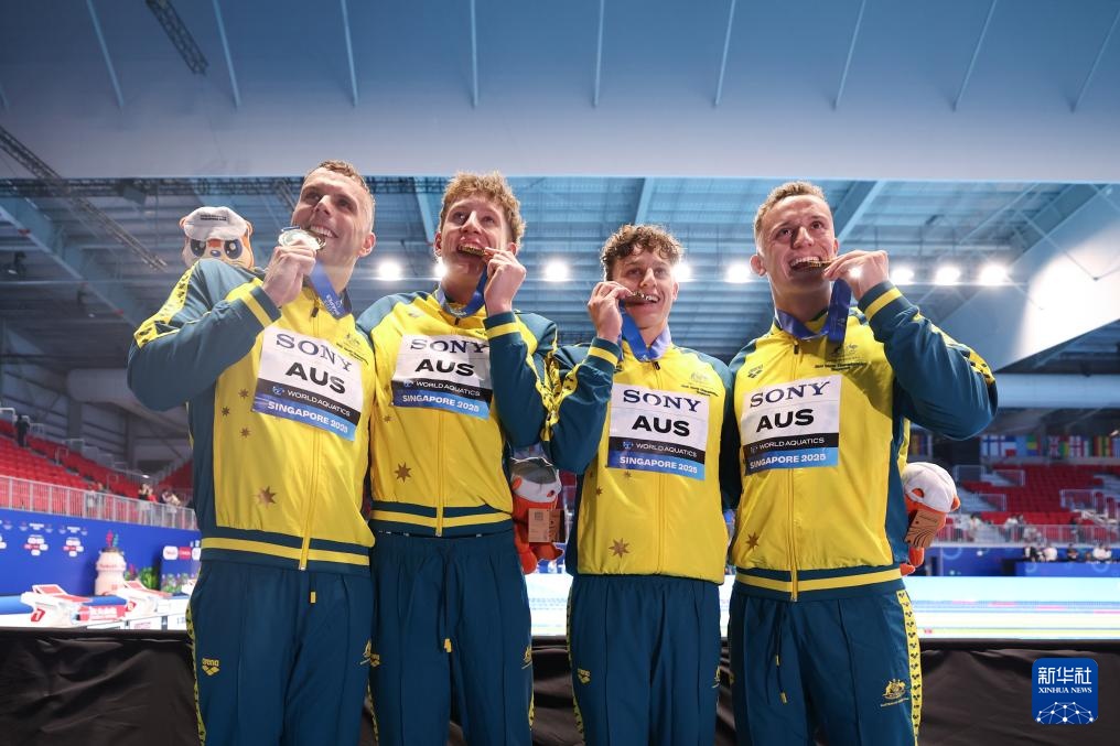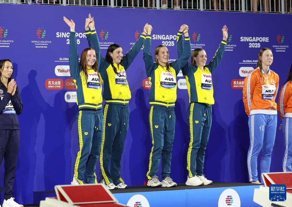 当日,2025年世界游泳锦标赛游泳男、女子4X100米自由泳接力决赛在新加坡举行。