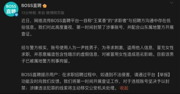 近日,网络流传BOSS直聘平台一自称“王某香”的“求职者”与招聘方沟通中存在低俗信息,我们对此高度重视,第一时间封禁了涉事账号,并配合山东属地警方开展查证。