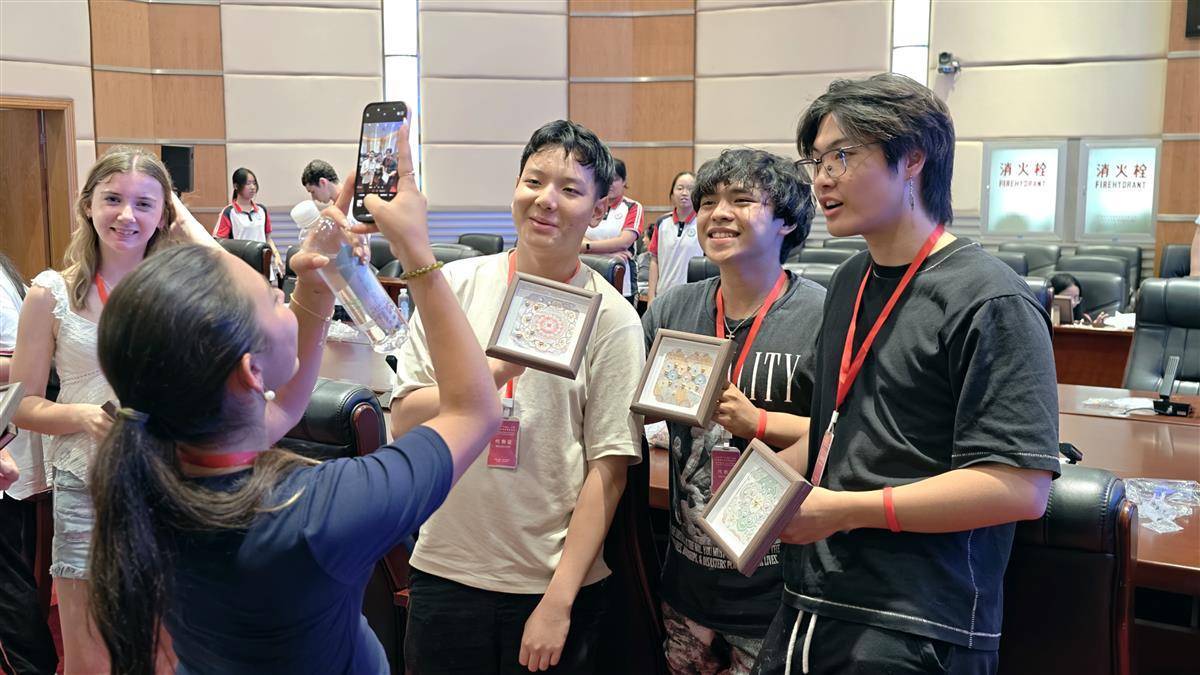 漆扇、书法体验区,夏令营成员们对中国笔法充满好奇,讲台前围满了人。太极扇教学,引发两国青年对抱拳礼与握手礼的热议,动作模仿间折射出文化碰撞。珍珠布贴制作时,老师细心指导,让成员们深切感受中国传统手工艺的乐趣。 (湖北日报全媒记者 陈少哲 摄)